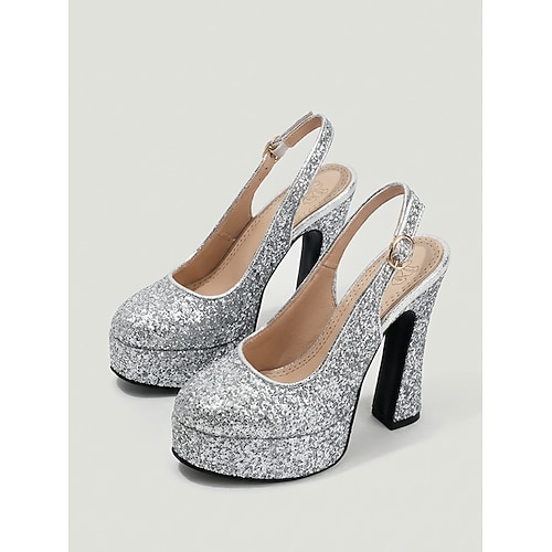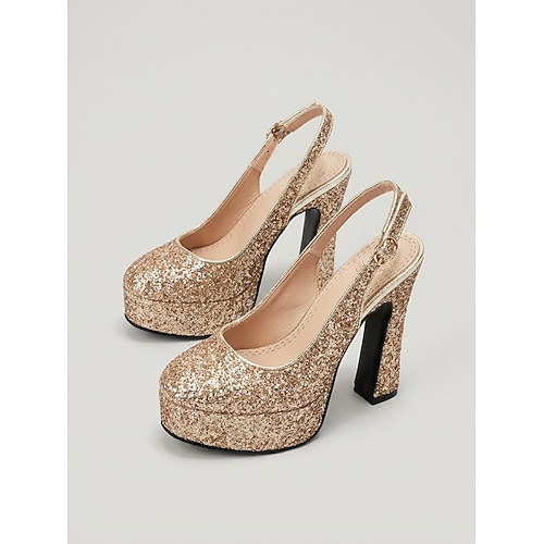 Goldene Glitzer-Plateau-Pumps im Disco-Stil der 1970er Jahre – glamouröse, klobige High Heels mit Fersenriemen für Retro-Partys und Studio-54-Galas Tanzen im Nachtclub