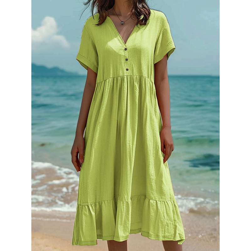 Women's Midi Dress Cotton Linen Dresses Summer Dress Fashion Casual Daily Regular Fit Solid Color Short Sleeve V Neck Light Green Dark Green Orange Dark Grey Summer