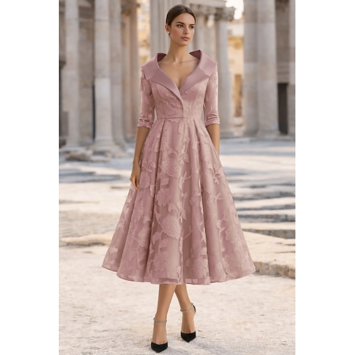 Linea ad A Lunghezza Tè Vestito da Festa Abito da Cocktail Abito da invitata a nozze Abito da cerimonia per signora Manica 3/4 Colletto a Camicia Elegante Vintage Formale Cocktail party Derby del