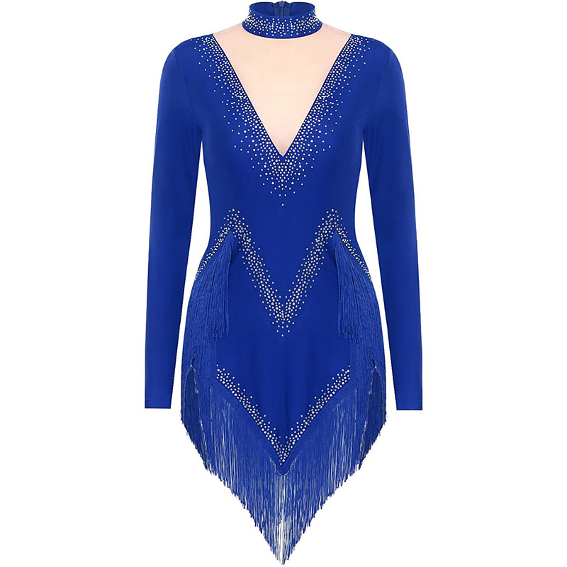 Women's Sparkly Latin Dance Dress Long Sleeve Tassel Cha Cha Salsa Rumba Tango Performance Costume