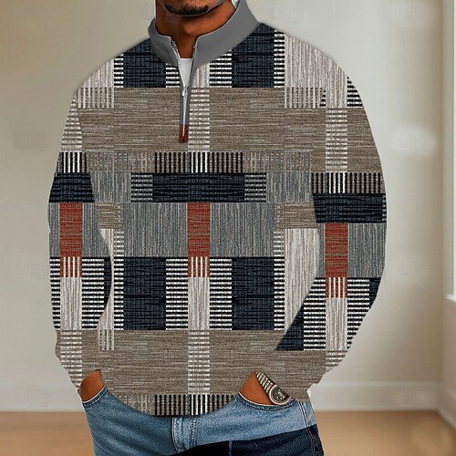Per uomo Blocco di colori Geometrico Polo Manica Lunga Colletto Mao Casual Vacanza Athleisure Casual Quotidiano Stampa 3D Primavera Autunno Blu Marrone Grigio