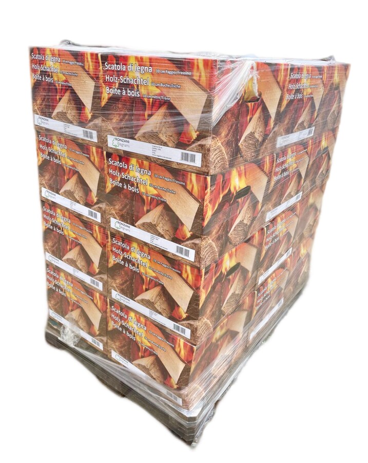 Brennholz aus buche und esche im 15-kg-schachtel. Palette 120x80x120 cm mit 24 Kisten mit Brennholz aus Buche und Esche.