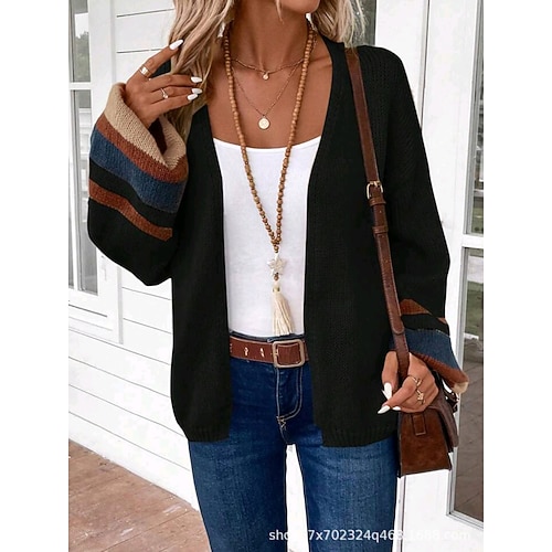 Per donna Cardigan Elegante Vacanza Vintage Aperto davanti Righe Spalla scesa Manica Lunga Top Regolari Maglia Scuola Casa Feste Nero Kaki Autunno Inverno