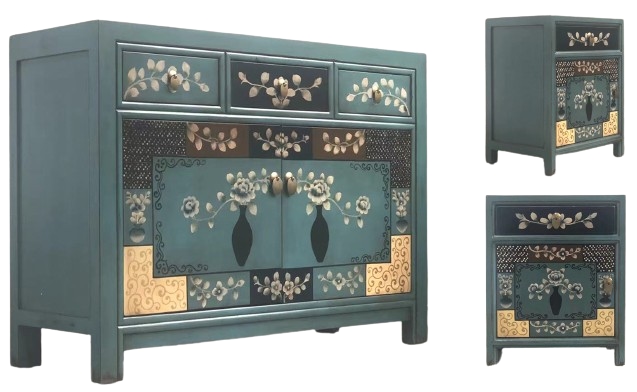OPIUM OUTLET Möbelset "Oceanflowers" asiatisch chinesisch orientalisch vintage, Kommode Schrank, 2 Nachttische Nacht-Konsolen, blau