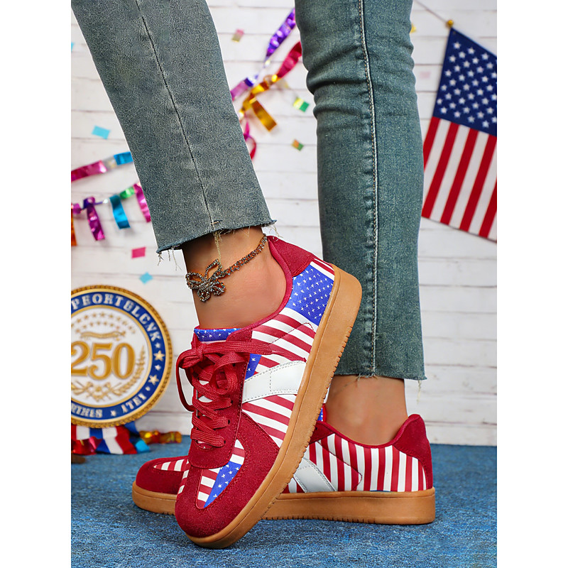 Women's USA Flag Sneakers with Stripes – Stylish Red Lace-up Sneakers for 4th of July, Fireworks Shows and 250th Anniversary Celebrations