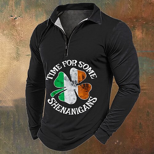 San Patrizio Per uomo Trifoglio Polo Manica Lunga Collo ripiegato Moderno Tempo libero Athleisure Casual Quotidiano Festival Cerniera Stampa 3D Primavera Autunno Nero Bianco Verde