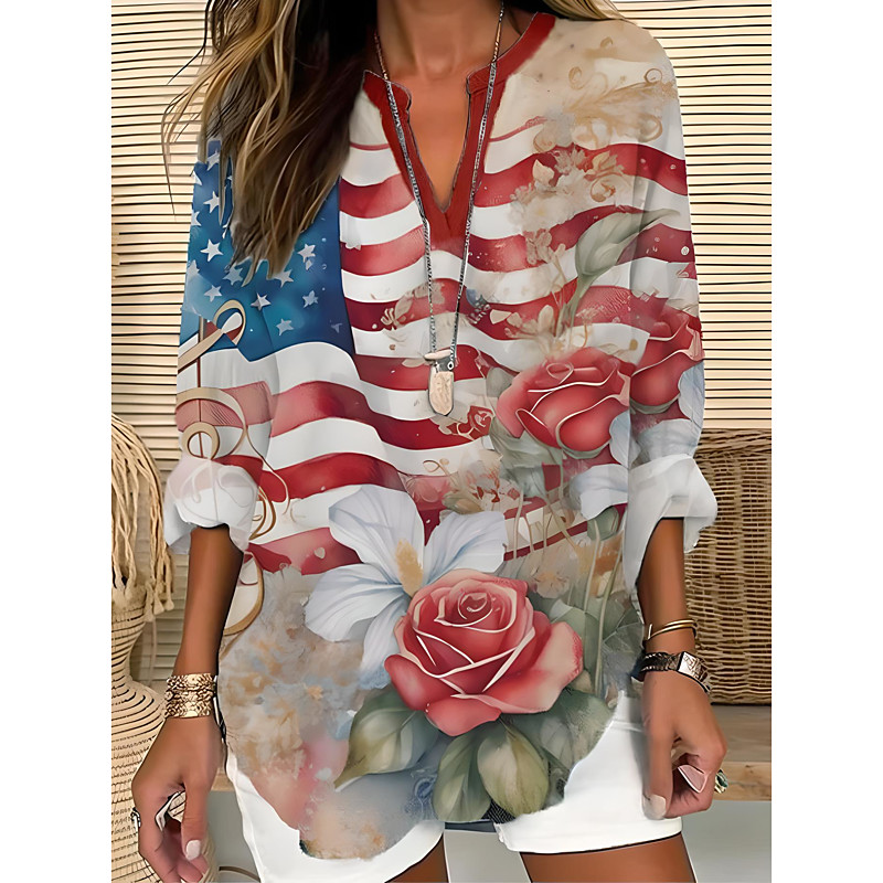 Women's Blouse Tunic V Neck Long Sleeve Boho Casual Patriotic Flag Red White And Blue Short Sleeve Regular Tops Daily Print Red Light Brown Blue