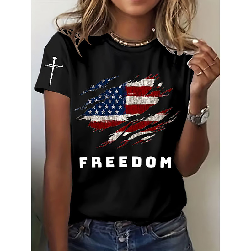 Women's T Shirt Graphic Letter American Flag Vintage Stylish Classic Short Sleeve Crew Neck Regular Tops Daily Print Black White Red Blue Summer Spring