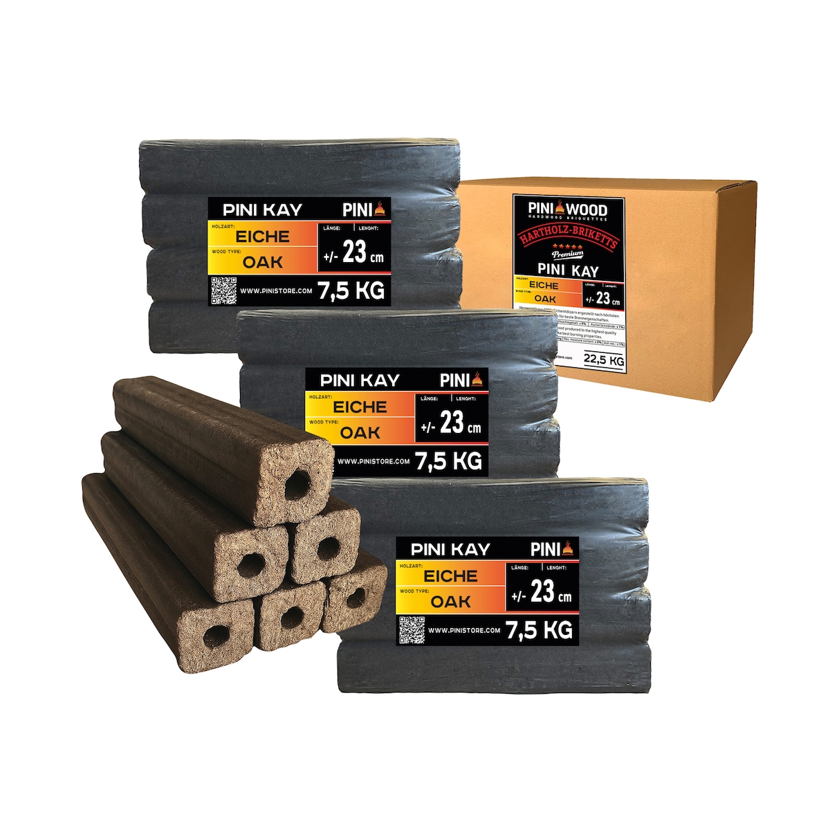 PINI Kay Eichenholzbriketts 23 cm lang viereckig mit Zugloch 22,5 kg Hartholzbriketts Brennholz Holzbriketts Eiche Kamin Ofen Feuerschale Grill