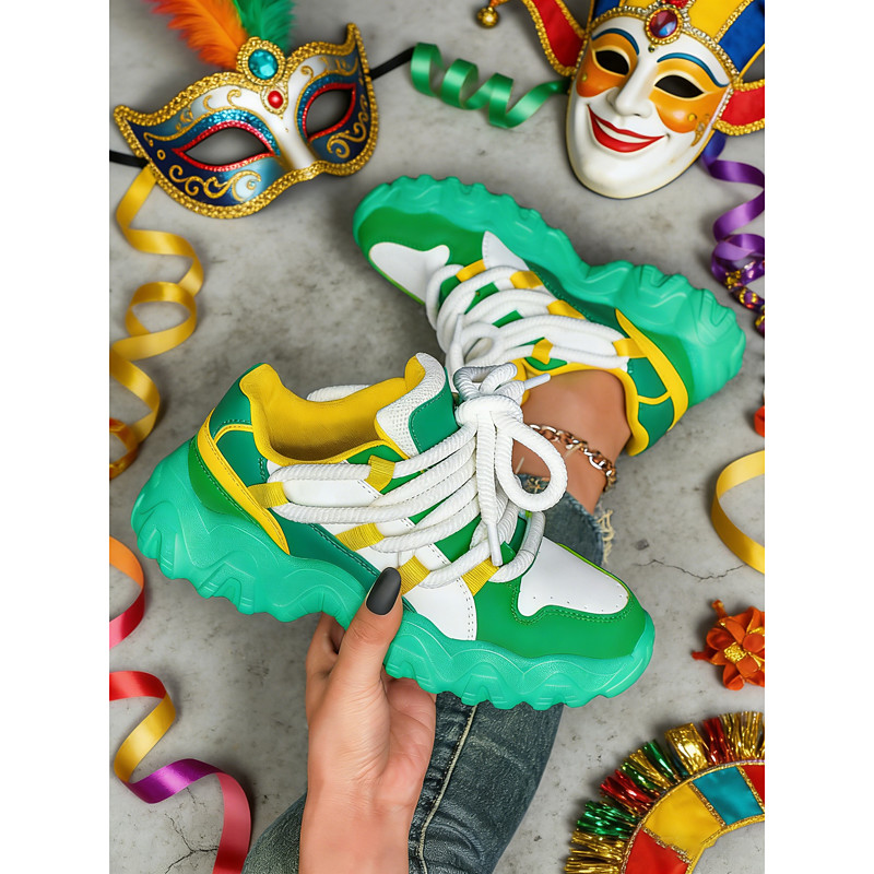 Women's Mardi Gras Green White Color Block Chunky Sneakers with Rope Laces – Vibrant Platform Shoes for Carnival, 90s Parties Urban Fashion