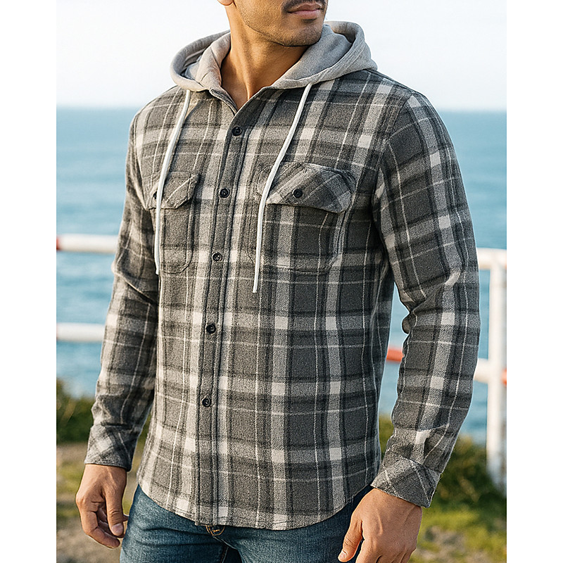 Men's Flannel Jacquard Jacket Hoodie Shirt Jacket with Pockets Long Sleeve Top Athleisure Plaid Checkered Windproof Warm Hiking Travel Vacation Sportswear Activewear Black Red Khaki