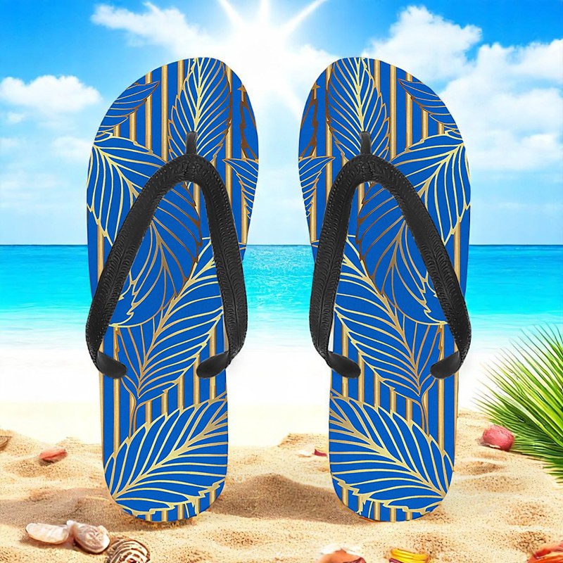 Men's Blue Leaf Printed Flip Flops – Tropical Stylish Style for Beach Vacations, Island Hopping Beachside Dinners