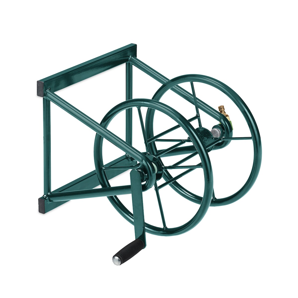 Relaxdays Schlauchtrommel, Wandmontage, für 60 m Schlauch, 2 Anschlüsse mit Klickstecker, Stahl, Schlauchhalter, grün