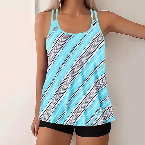 Costume da bagno a due pezzi Tankini da donna con pantaloni corti arricciati senza schienale per vacanze al mare grafica ombre scollo a barca senza maniche