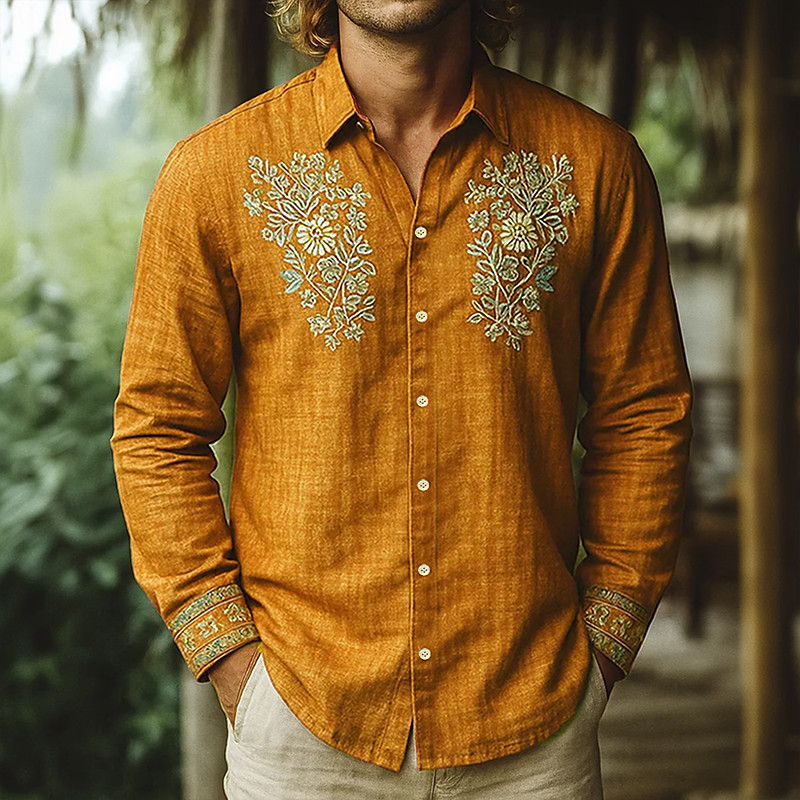 Men's Floral Print Ethnic Flowers Shirt Button Up Shirt Casual Dress Shirt Long Sleeve Vintage Retro Office Dailywear Spring Fall Turndown 3D Print Linen Like Shirt Yellow Blue Orange
