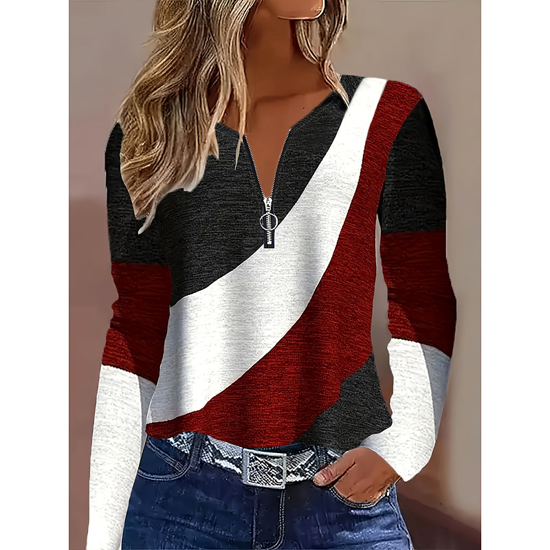 Women's T Shirt Graphic Geometric Color Block Vintage Stylish Classic Long Sleeve V Neck Regular Tops Daily Weekend Zipper Print Wine Fall Winter