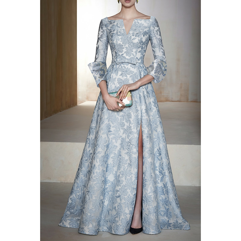 A-Line Floor Length Evening Gown Ball Gown Formal Dress Elegant Floral High Split Long Sleeve V Neck Wedding Formal Pocket Jacquard Cowl Back with Floral Print Pocket