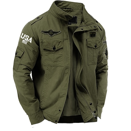 Herren Amerikanische US-Flagge USA Cargo-Jacke Windbreaker Militärjacke Praktisch Lässig Outdoor Campen und Wandern Bestickt Seitentaschen Frontreißverschluss Herbst Winter Stehkragen Langarm Schwarz