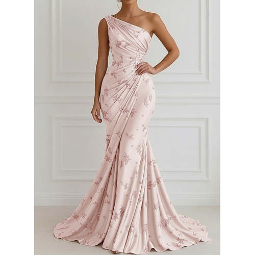 Sirena Tromba Strascico a Terra Abito da Sera Elegante Floreale Setoso Senza Maniche Monospalla Festa serale Festa in giardino Raso Jacquard con Arricciato