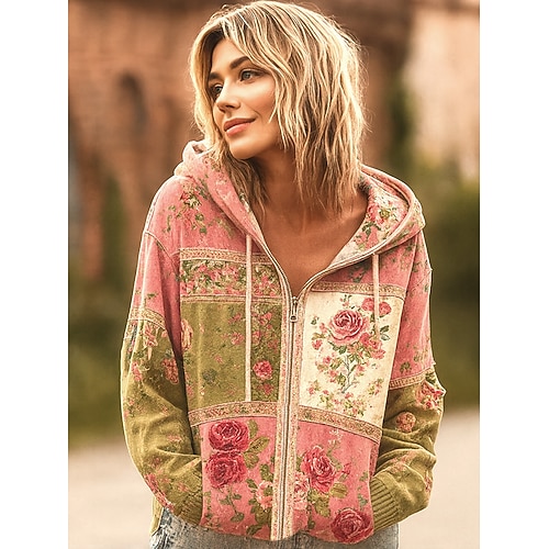 Felpa con cappuccio vintage boho 3D stampata da donna felpa con cappuccio patchwork felpa con zip floreale punk attiva vintage a maniche lunghe con cappuccio quotidiano casual patchwork rosa rosa