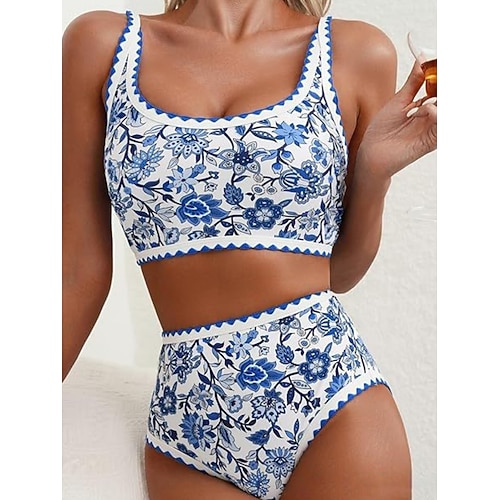 Womens Bikini 2 Pezzo Costume da Bagno Boho Briefs Slim Schiena Nuda Vacanza Mare Wear Floreale U Collo Senza Maniche Costumi da Bagno