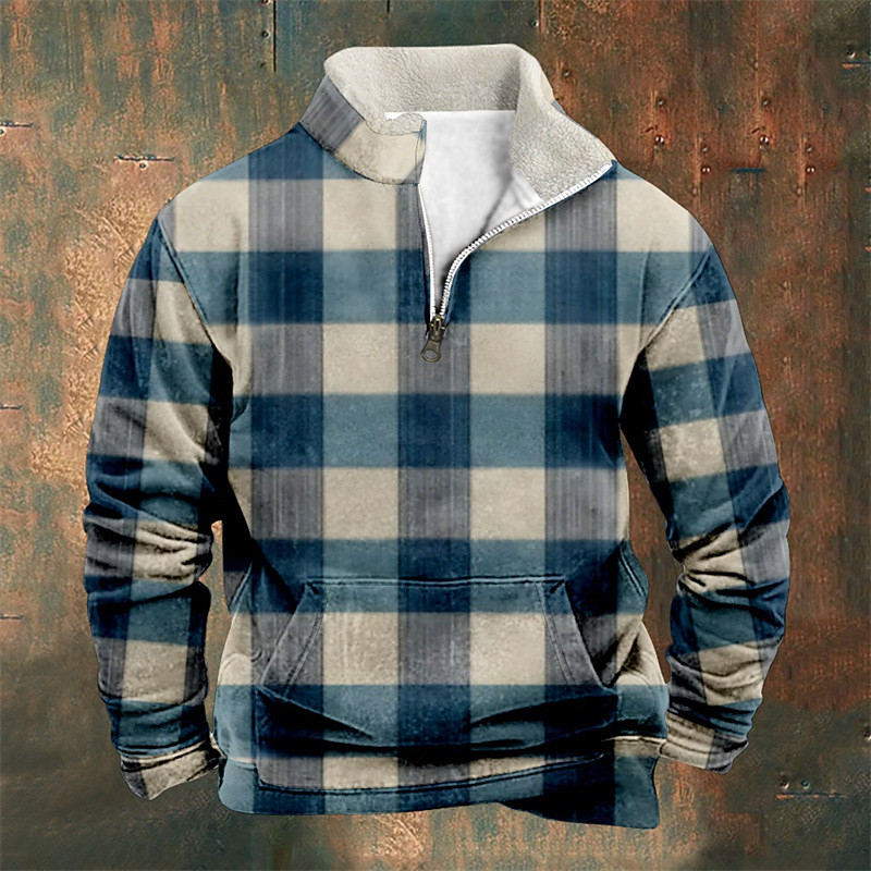 Men's Sweatshirt Fleece Sweatshirt Quarter Zip Sweatshirt Blue Orange Brown Khaki Brown 2 Half Zip Geometric Plaid Quarter Zip Sports Outdoor Daily Holiday Polyester Streetwear Basic Casual Fall