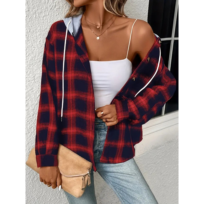 Women's Casual Jacket Hoodie Jacket Comfortable Breathable Buttons Print Casual Plaid Vacation Street Daily Wear Going out Single Breasted Regular Hooded Regular Fit Long Sleeve Outerwear Pink Red