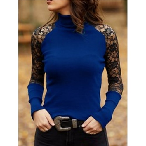 Per donna Blusa Tinta unica Elegante Casual Manica Lunga Collo Alto Top Regolari Quotidiano Pizzo Patchwork Blu Nero Vino Blu Reale Viola Primavera Autunno Inverno