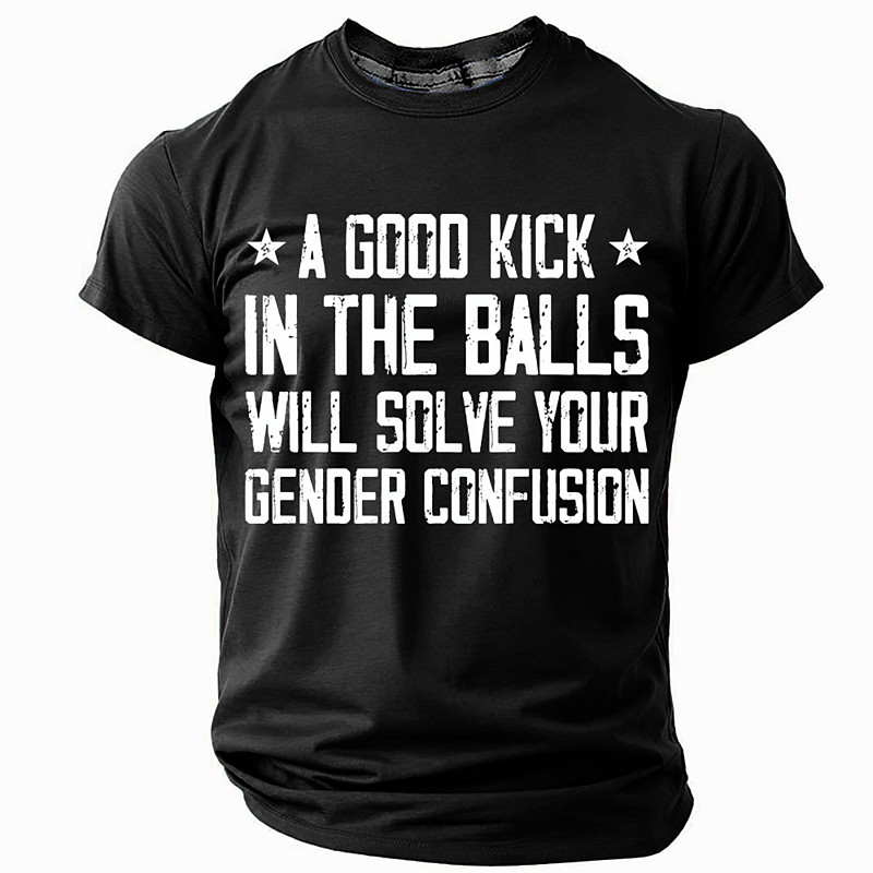 Men's Short Sleeve T-Shirt with 'A Good Kick In The Balls Will Solve Your Gender Confusion' Graphic Print, Crew Neck Casual Top