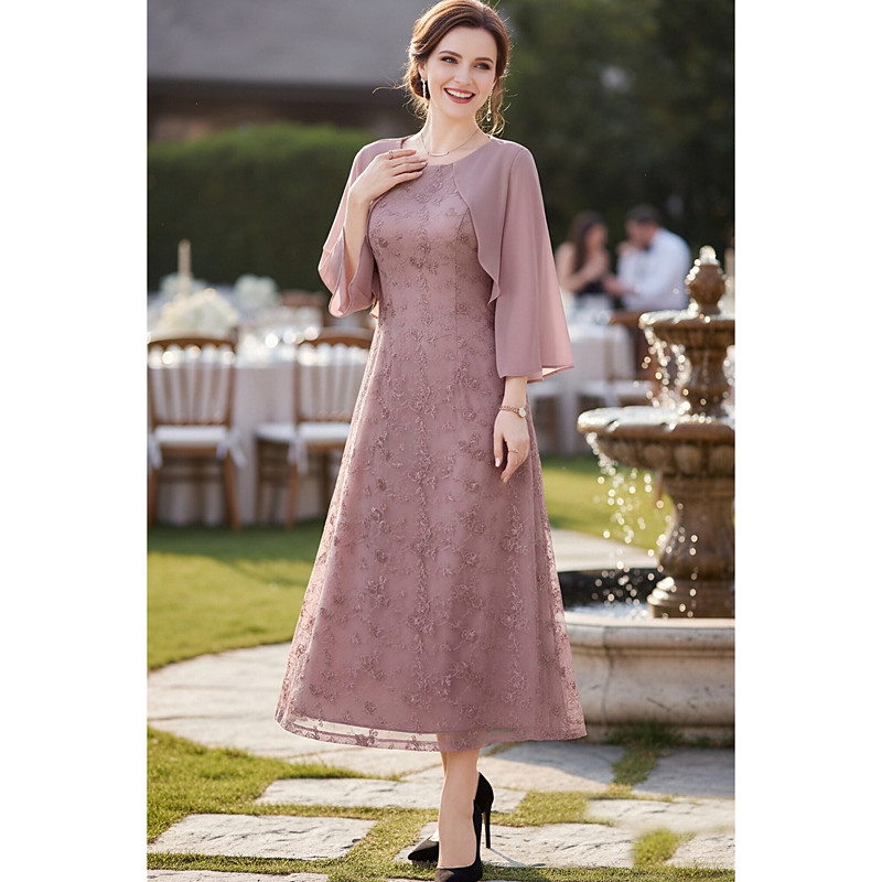A-Line Ankle Length Party Dress Cocktail Dress Mother of the Bride Dress 3/4 Length Sleeve Crew Neck Elegant Simple with Lace