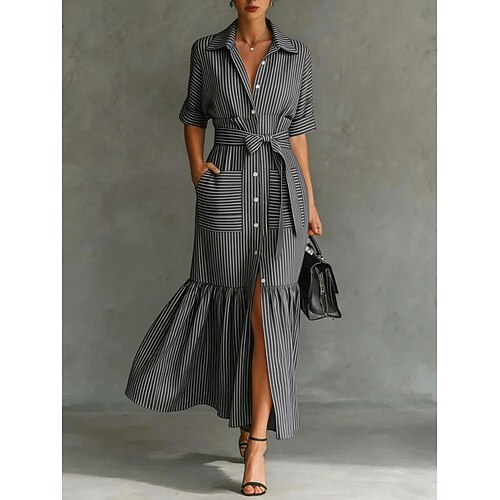 Per donna Abito maxi Abito a trapezio Casual Quotidiano Vestibilità comoda A righe Manica Lunga Bavero Blu Nero Rosso Primavera Autunno