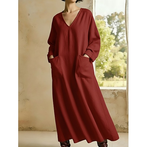 Per donna Abito maxi Vestito Casual Abito in cotone e lino Elegante Moda Moderno All'aperto Vacanza Uscire Vestibilità comoda Semplice Manica Lunga Scollo a V Bianco Giallo Borgogna Cachi Estate