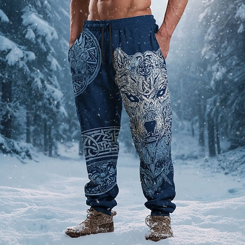 Herren Wolf Wikinger Keltische Kunst Jogginghose Hose Mittlere Taille Kordelzug Elastischer Bund Vintage-Retro Outdoor Campen und Wandern Jagd Sportliche Jogginghose mit Taschen Herbst Winter 3D-Druck