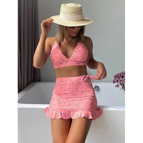 Damen Bikini 3-Teilig Badeanzug mit Rock Rock Slim Rückenfrei Urlaubs Strandbekleidung Floral Halterneck Ärmellos Bademode