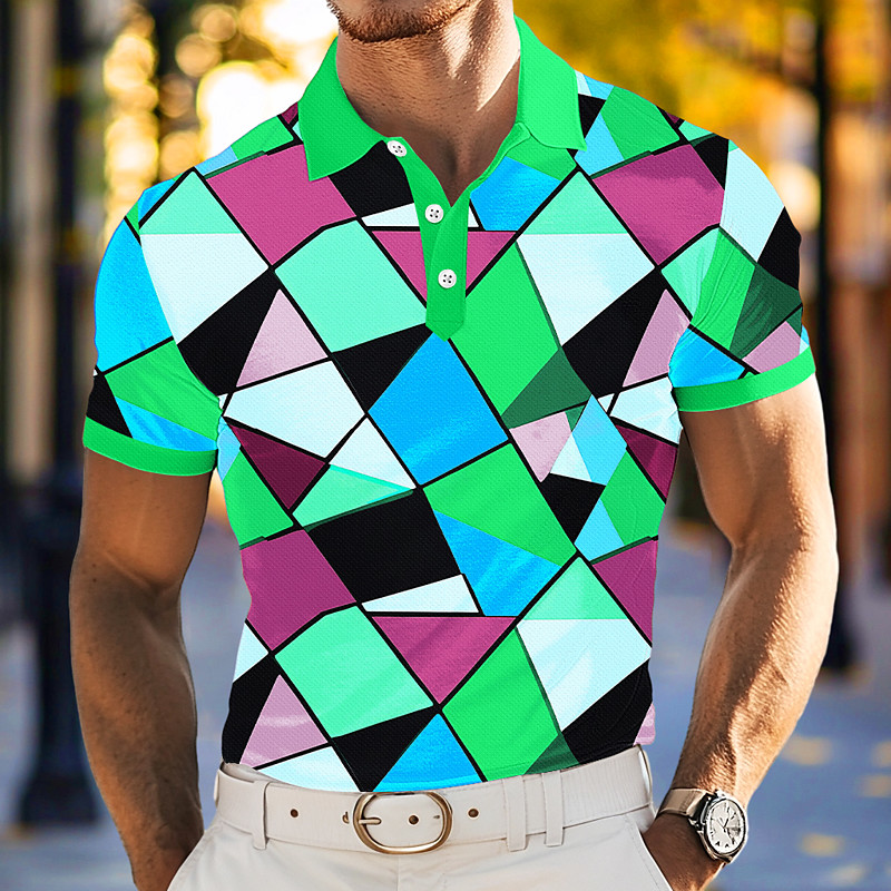 Men's Polo Vacation Street Turndown Short Sleeve Vacation Geometric Color Block Buttons Summer Spring Regular Fit Brown Yellow Green Purple Polo