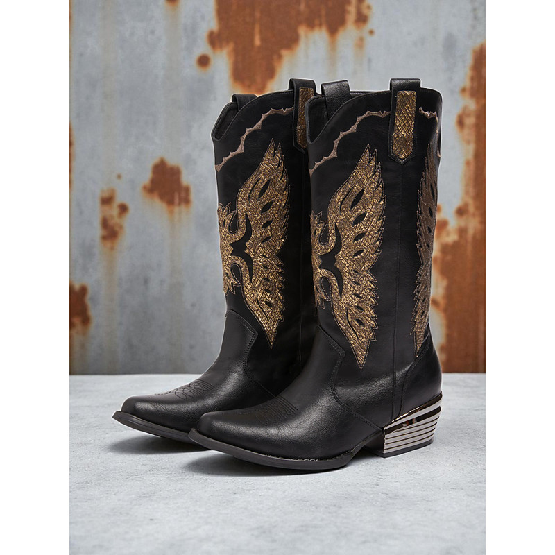 Women's Blue Denim Western Cowboy Boots with Embroidered Detail – Mid-Calf Pointed Toe Boots for Music Festivals, Rodeo Events and Country Style Outfits