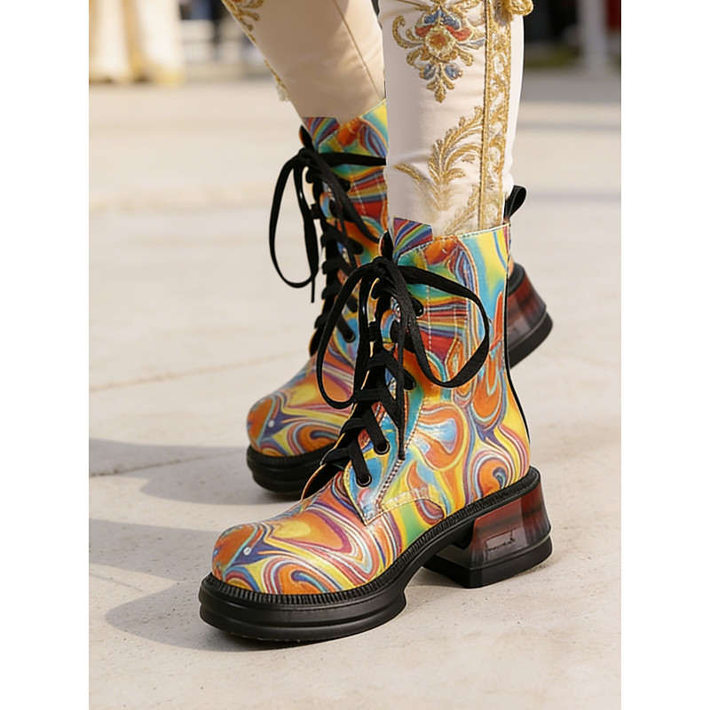 Women's Mardi Gras Multicolor Patchwork Ankle Boots, Vintage Block Heel Zipper Boots for Venice Carnival Festival