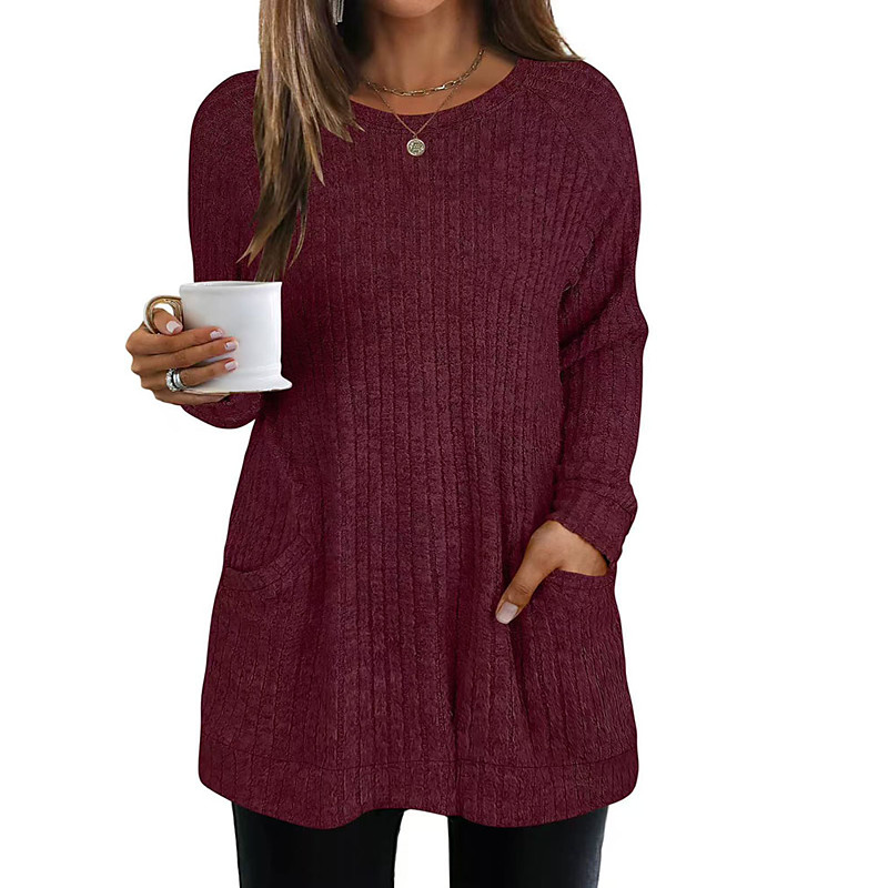 Women's Sweater Pullover Streetwear Casual Solid Color Crew Neck Pocket Knitted Long Sleeve Long Tops Knit Daily Holiday Going out Wine Red Black Fall Winter