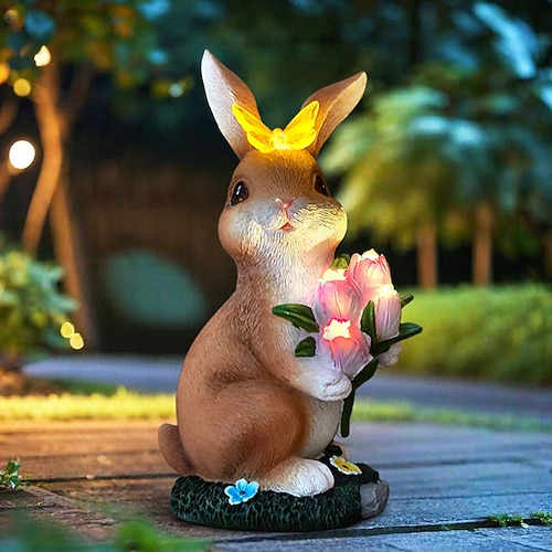 Osterhase mit Tulpen und Schmetterling, beleuchtete Kunstharzfigur, solarbetrieben, wasserdicht, für Garten, Hof, Gartenwege und Rasen, niedliche Tierfigur für Bauernhof und Landschaftsgestaltung