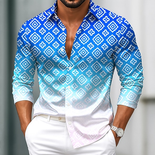 Herren Geometrisch Farbverlauf Hemd Satinhemd Kleidhemd Langarm Vintage-Retro Urlaub Alltagskleidung Sommer Frühling Herbst Umlegekragen 3D-Druck Hemden mit Knopfleiste Blau Grün
