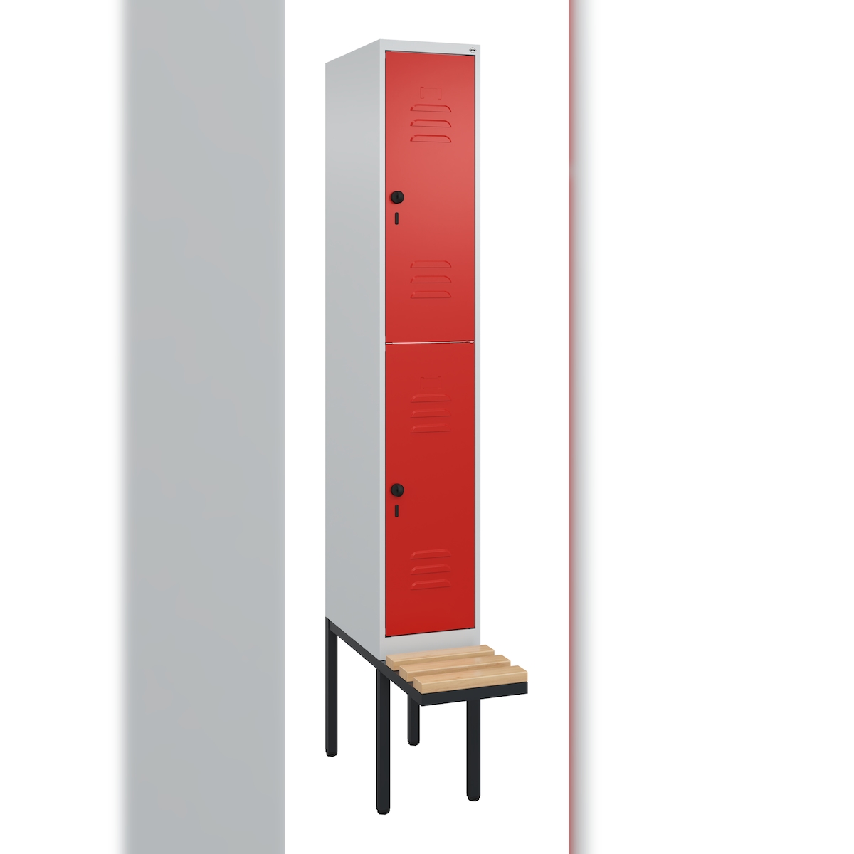 C+P Spind Classic PLUS, Buche schwebende Sitzbank, 2 Abteile, HxBxT 212x30x82cm, Sicherheitsdrehriegel, Hellgrau/Rot von PROREGAL
