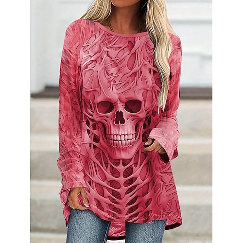 Womens T-Shirt Totenköpfe Grafik Vintage Stilvoll Lässig Langarm Rundhalsausschnitt Lange Oberteile Täglicher Druck Schwarz Grau Frühling Herbst