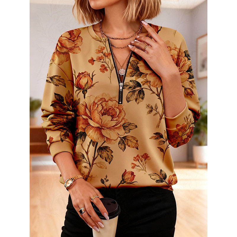 Women's Pullover Sweatshirt Zip Up Sweatshirts Floral Fashion Casual Long Sleeve Crew Neck Regular Tops Street Dailywear Casual Zipper Print Yellow Pink Green Spring Fall Winter