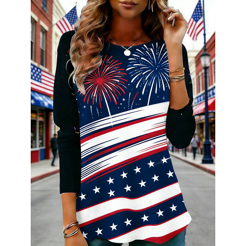American Independence Day Women's T Shirt Tee Top Graphic American Flag Fashion Stylish Classic Long Sleeve Crew Neck Regular Tops Daily Weekend Vacation Wear Print Blue Spring Fall