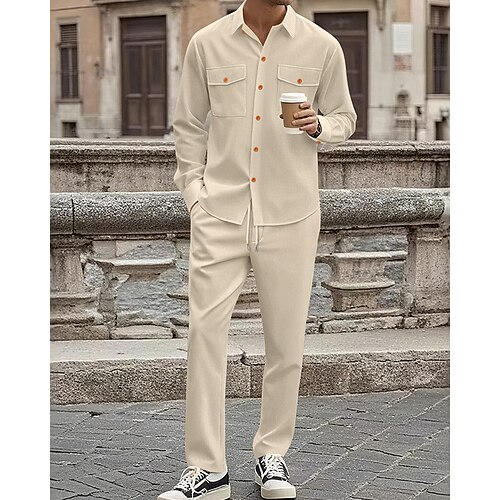 Per uomo Camicia camicia di lino Camicia estiva Abbigliamento mare Tinta unica Strada Hawaiano Verde militare Nero Bianco Arancione Manica lunga Colletto Abbigliamento