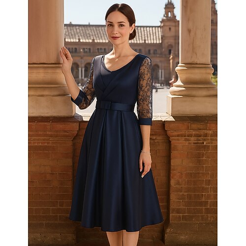 A-Line lunghezza tè abito da festa abito da cocktail abito da invitata di nozze abito madre della sposa manica 3/4 collo a giro elegante vintage festa con pizzo e pieghe