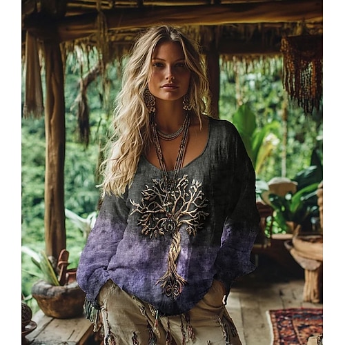 T-shirt VIKING Boho da Donna T-shirt Tee Top Grafica Floreale Bohemia Vintage Etnica Manica Lunga Collo Giro Top Regolari Quotidiani Weekend Vacanza Stampa Blu Rosso Viola Fucsia Verde Estate