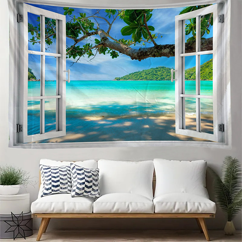 3D Window View Tapestry Wall Hanging Tropical Beach Ocean Landscape Palm Tree Fake Window Wall Art Decor For Living Room Bedroom Mural