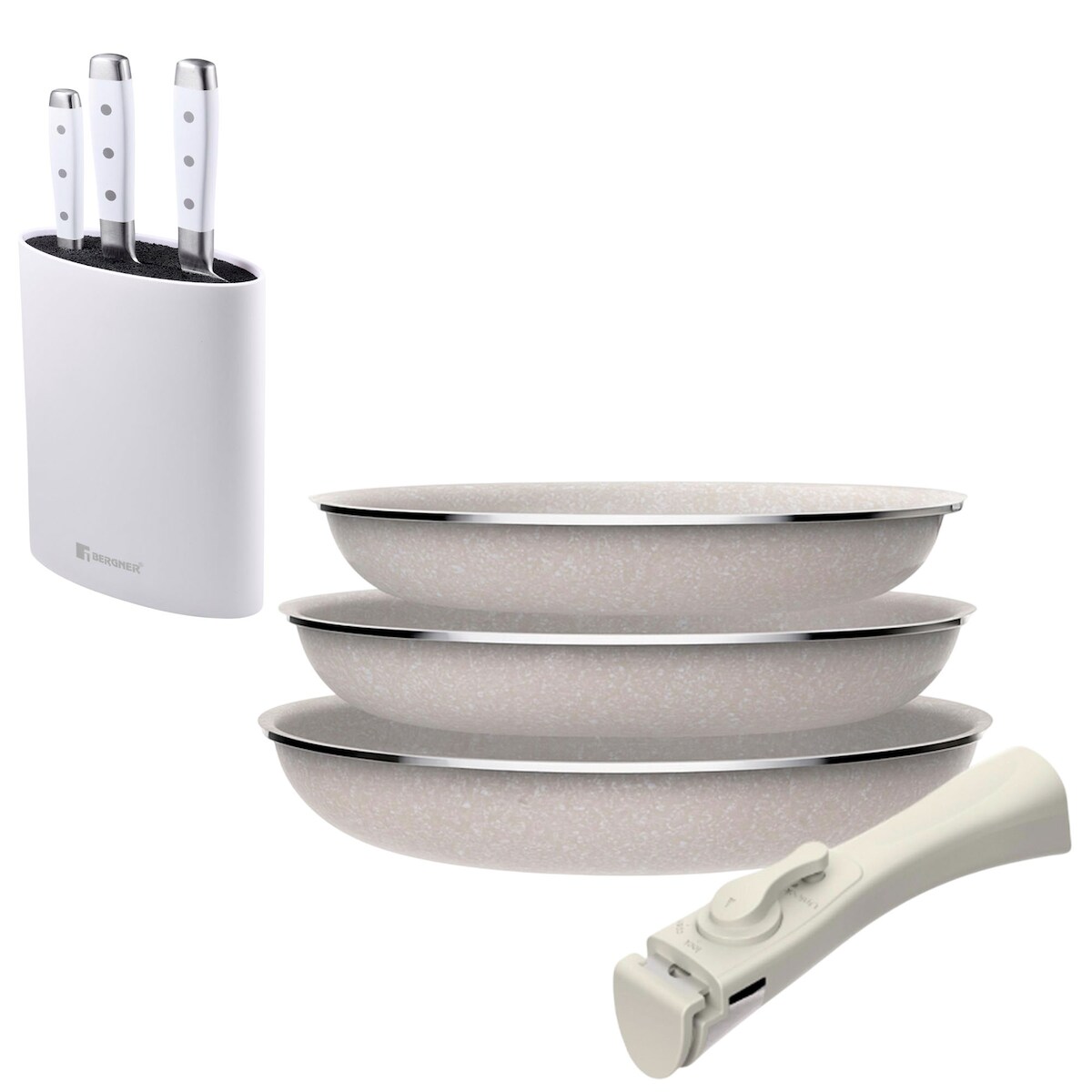 BERGNER - Set aus 3 Pfannen Ø18/20/24 cm aus gepresstem Aluminium Antihaftbeschichtung mit abnehmbarem Griff mit Set aus 3 Edelstahlmessern mit Tacoma