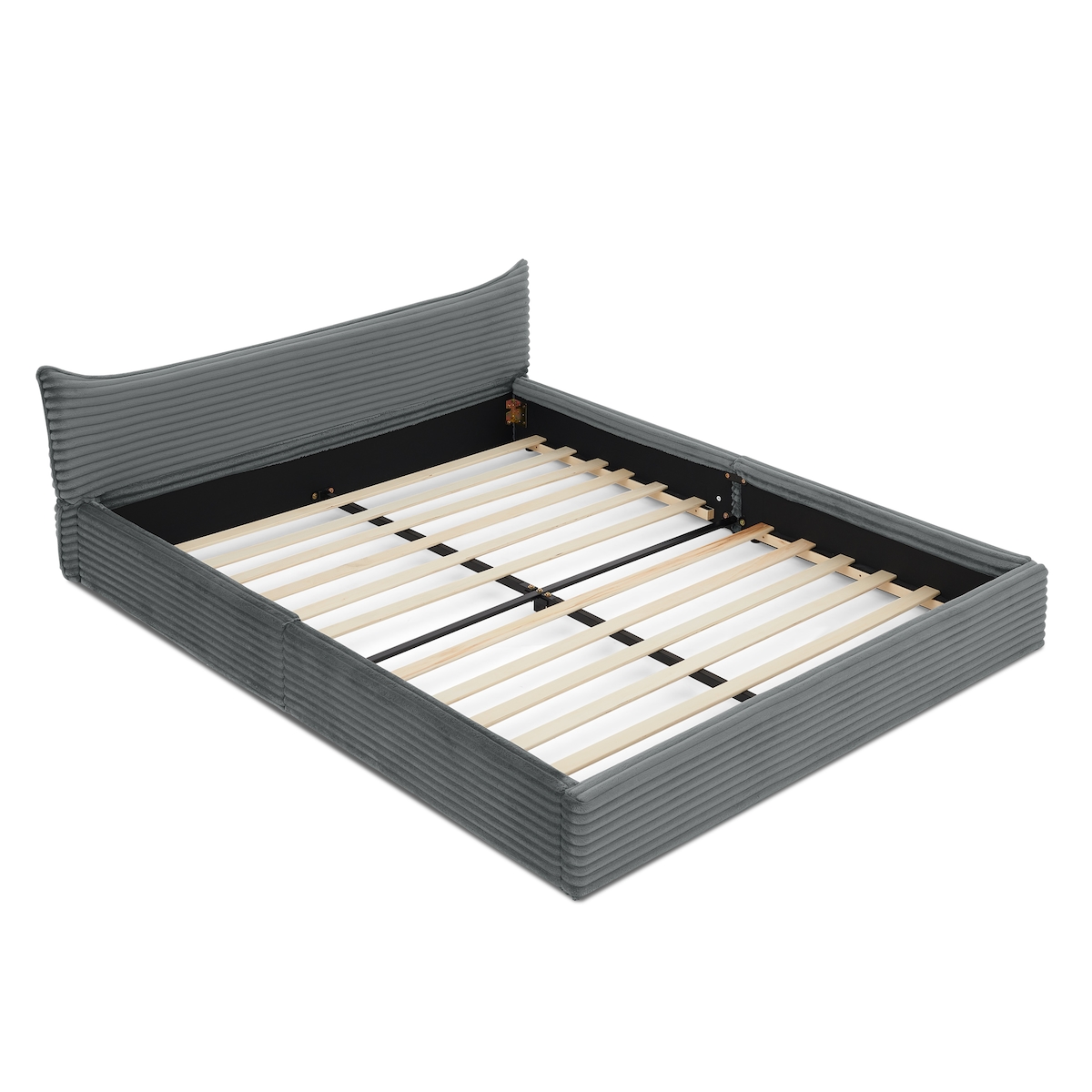 MODFU Doppelbett 160x200 cm, elegant mit Corduroy-Bezug in Dunkelgrau, stabiler Eisenrahmen aus Eukalyptusholz, modernes Design